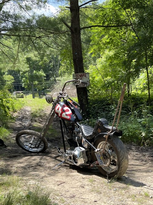 The bike fired up Friday afternoon and was still in need of a valve adjustment but my head was on that reefer and there was too many chefs in the proverbial kitchen to dial it in, but I took it for a ride around the property just the same. The tires were damn near flat, I hadn’t ridden a 24″ over front ended bike in years and I was high but all I had to do was ride it a few feet and it was going to be a victory in my mind…it went like this…